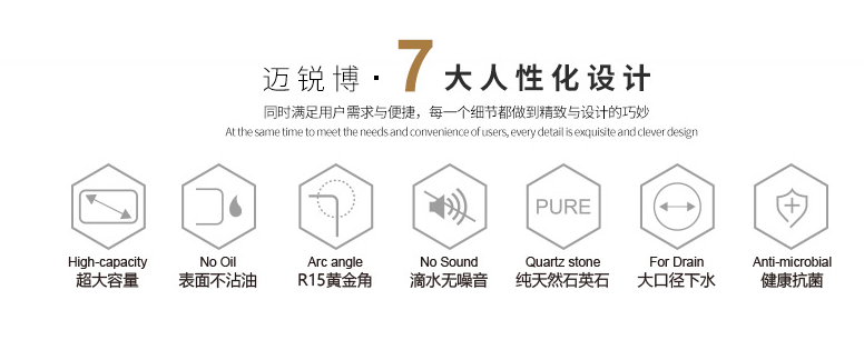 迈锐博致力于水槽行业的研发,德国进口石英石材质加持,更加精细的产品加工,在意每一位用户的真实体验。迈锐博石英石水槽严格执行《家用厨房设备通用技术要求》、《家用厨房设备试验方法与检验规则》等国家标准,并对厨卫产品进行严苛的品质检测,从而保证了消费者所购买的迈锐博石英石水槽的品质。生产过程中严格遵守高于行业标准的生产要求,把控产品质量关,十年超长质保,给每一位客户加上一把安心锁。
